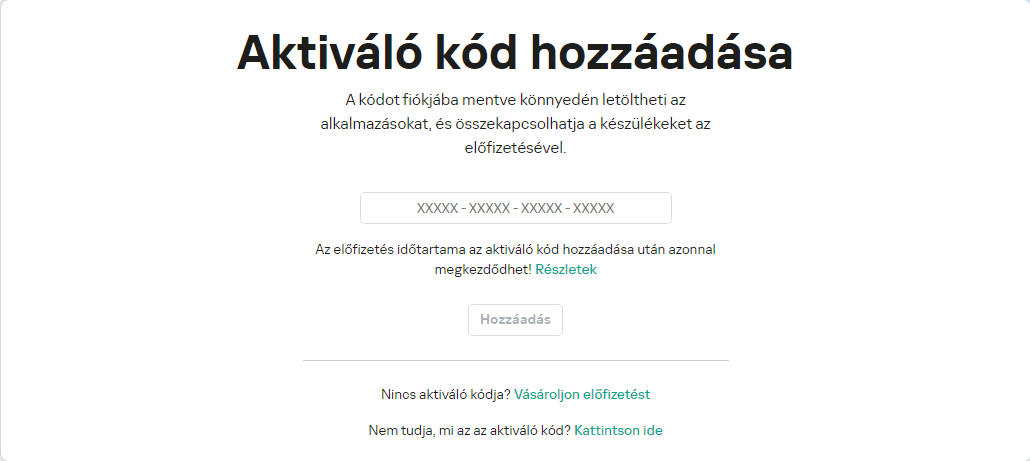 Az aktiváló kódot mostantól a My Kaspersky-fiókjában tárolhatja. Egy új eszköz védelméhez jelentkezzen be a fiókba, és töltse le az alkalmazást. Az aktiváló kódot manuálisan is megadhatja az alkalmazásban.